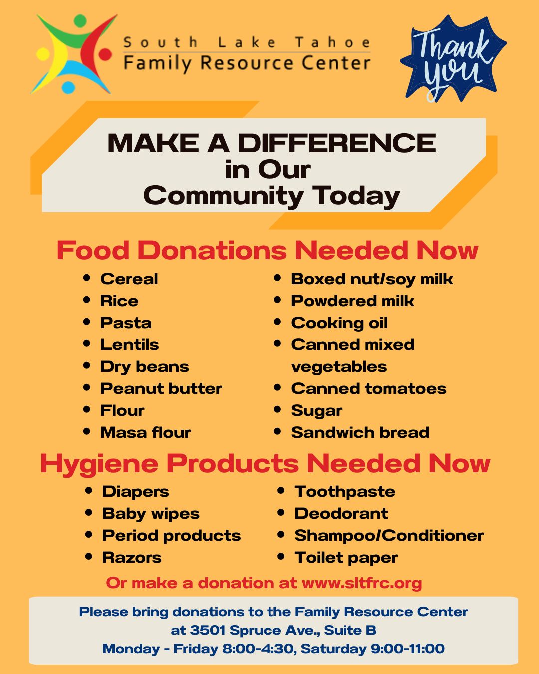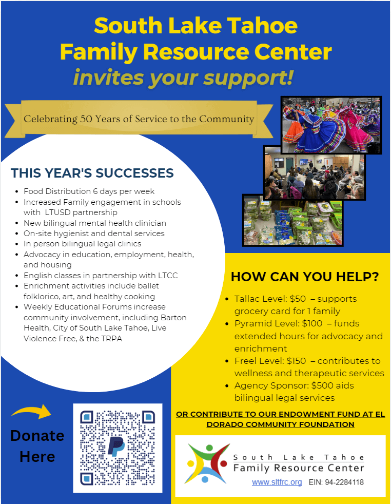 We are a public benefit, not for profit 501c3, CA corporation, and entered into partnership with the Lake Tahoe Unified School District in 2023, sharing a Director position between the school district and the Family Resource Center. We are grateful for support from Lake Tahoe Community College, El Dorado County Mental Health Department, New Morning Youth and Family Servics, and many other partner agencies, volunteers, and members of our community. We are open as below, except national holidays and some LTUSD school breaks:
