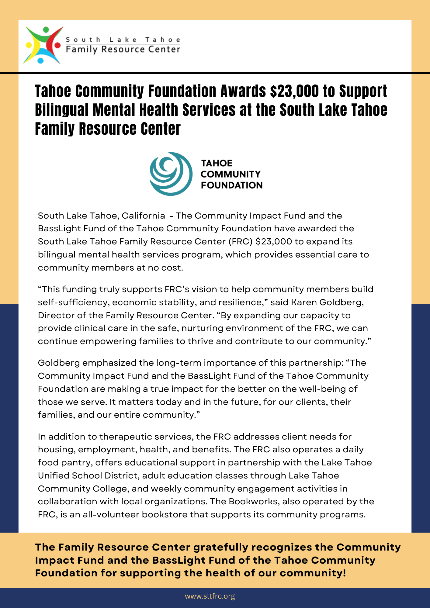 The mission of the South Lake Tahoe Family Resource Center is to enable individuals and families to achieve self-sufficiency and economic stability, to develop resilience in both parents and children, and to allow families to become a contributing part of the community.